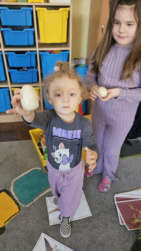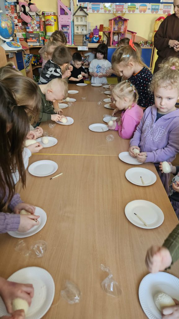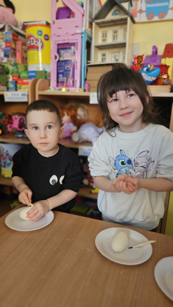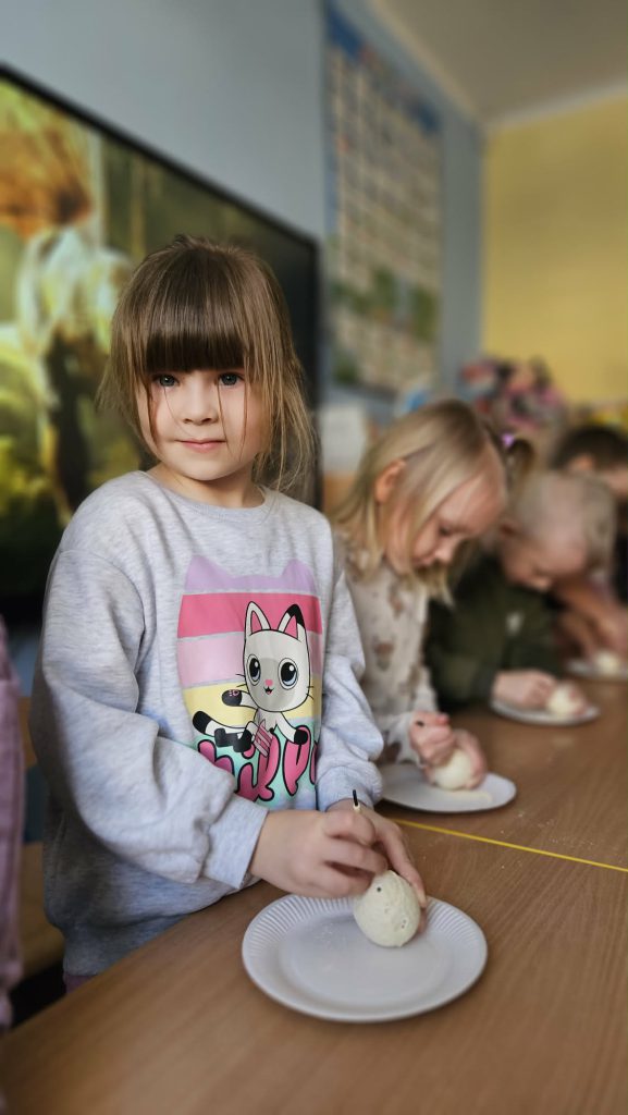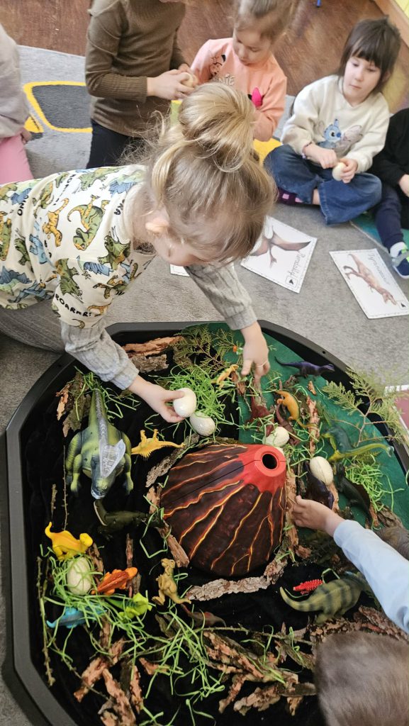 Z ogromnym zaangażowaniem i entuzjazmem dzieci stukały, pukały oraz delikatnie omiatały znaleziska pędzelkami. Wymagało to skupienia i cierpliwości, ale przedszkolaki poradziły sobie znakomicie. Po chwili z tajemniczych jaj zaczęły wyłaniać się dinozaury, wywołując radość i dumę małych odkrywców.