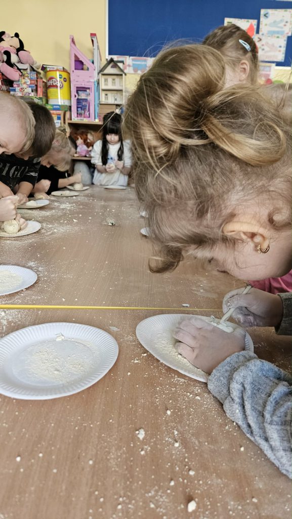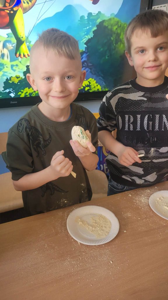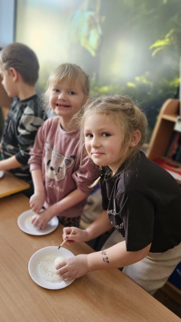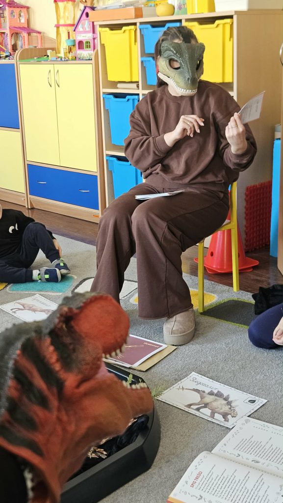 Nie zabrakło również naukowych wyzwań. Dzieci zapoznały się z pracą paleontologa naukowca, który bada ślady dawnych organizmów i odkrywa tajemnice sprzed milionów lat. Przedszkolaki mogły poczuć się jak prawdziwi badacze, ucząc się cierpliwości, dokładności i współpracy.