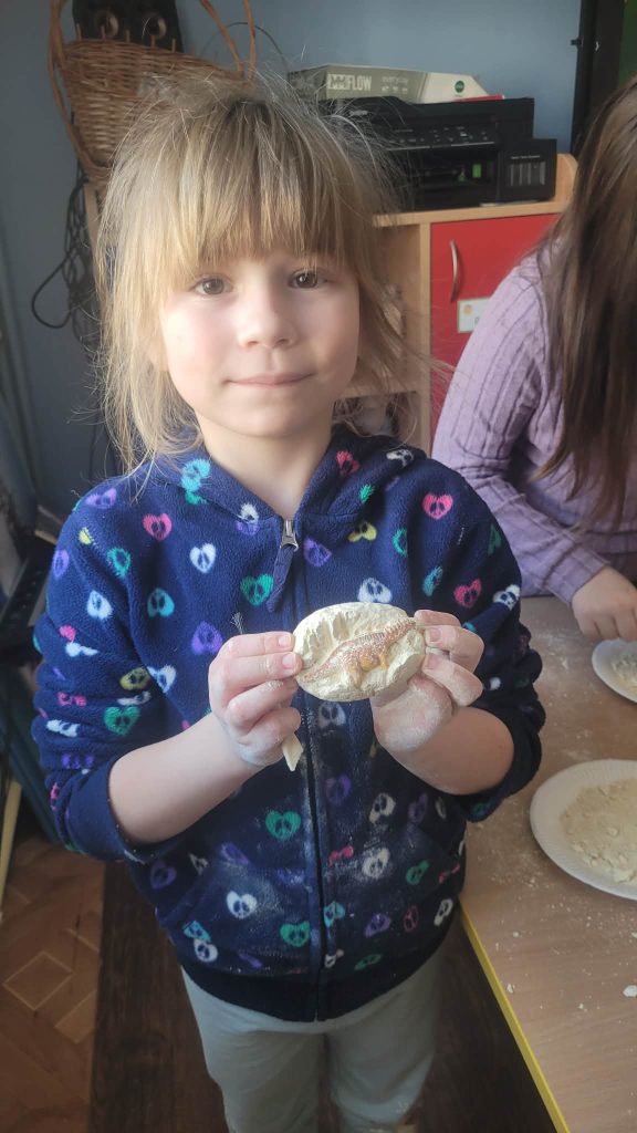 Największą atrakcją była jednak część praktyczna. Na zakończenie zajęć mali odkrywcy sami wcielili się w rolę paleontologów i rozpoczęli poszukiwania dinozaurów. Każde dziecko otrzymało skamieniałe jajo dinozaura, w którym ukryta była niespodzianka. Zadanie polegało na odkryciu, jaki dinozaur znajduje się w środku a wcale nie było to łatwe!