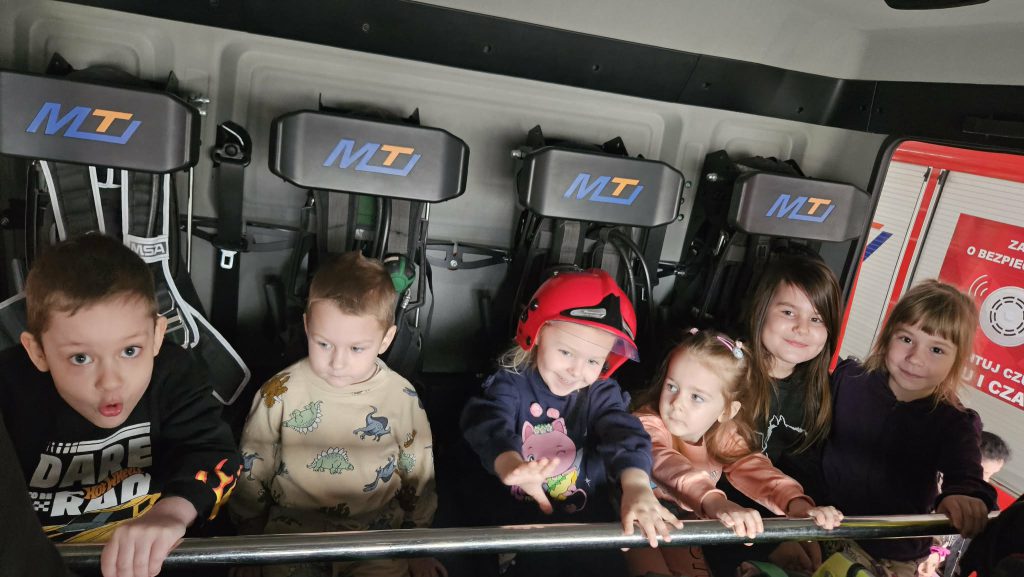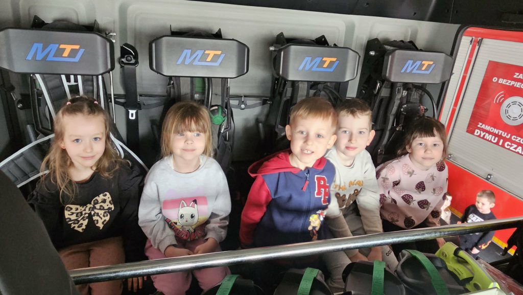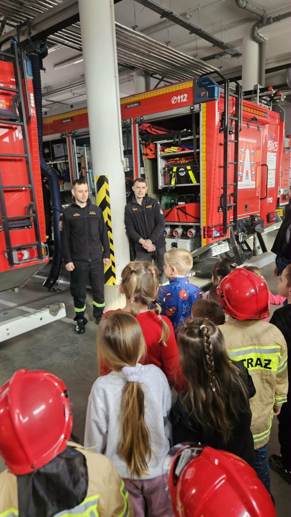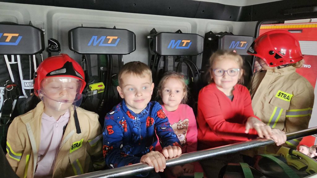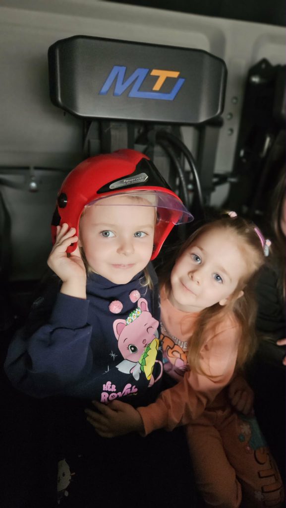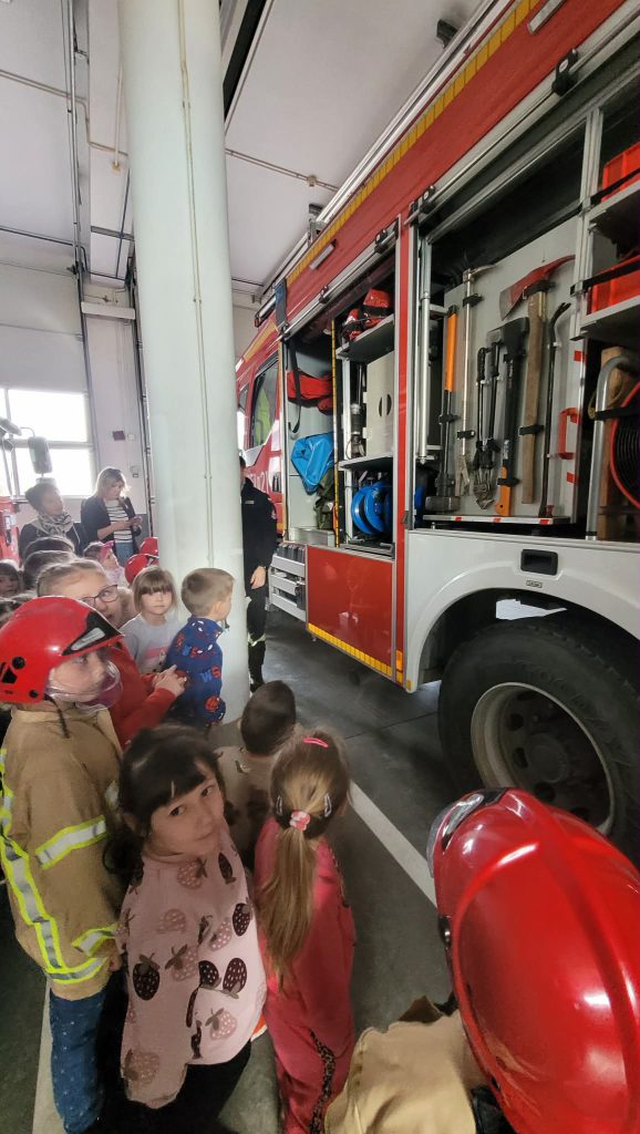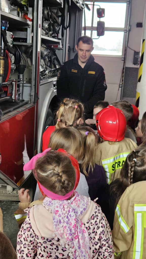 Kolejnym punktem wizyty było zwiedzanie strażnicy. Dzieci mogły z bliska obejrzeć wozy strażackie oraz sprzęt wykorzystywany podczas akcji ratowniczych. Największą radość sprawiła im możliwość wejścia do środka wozu i poczucia się przez chwilę jak prawdziwi strażacy.