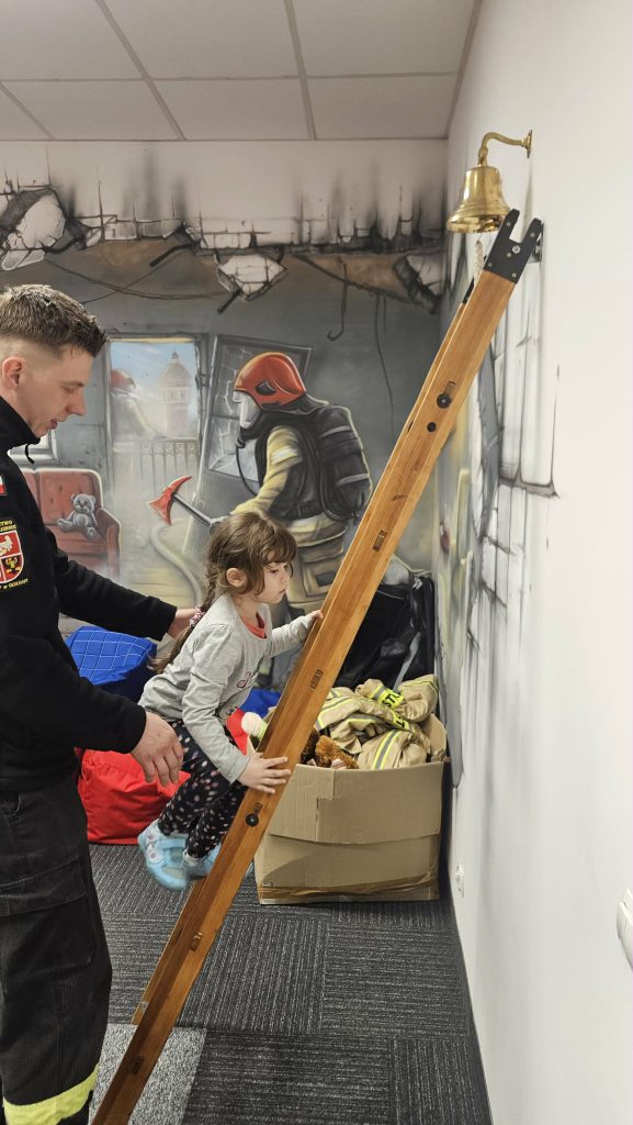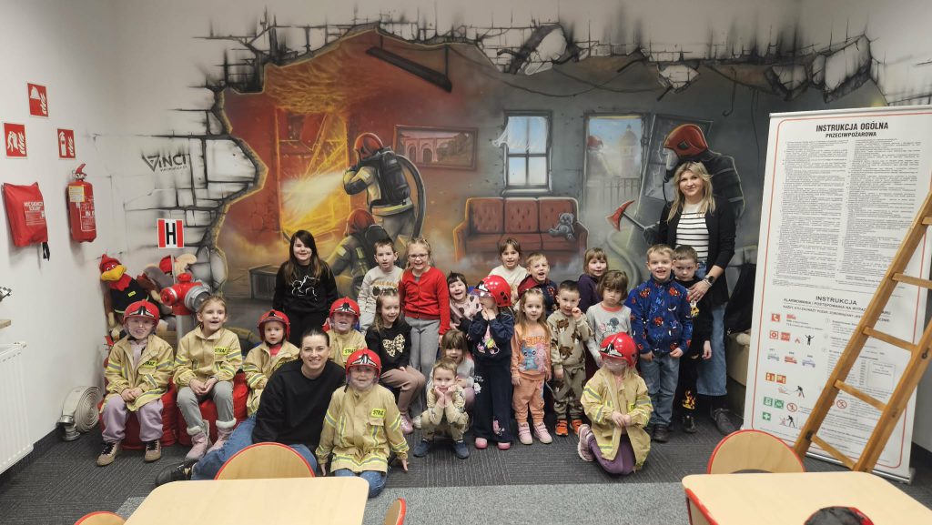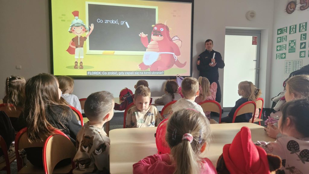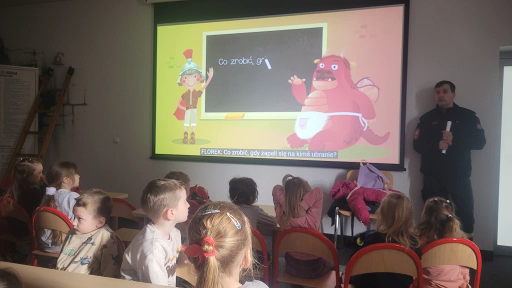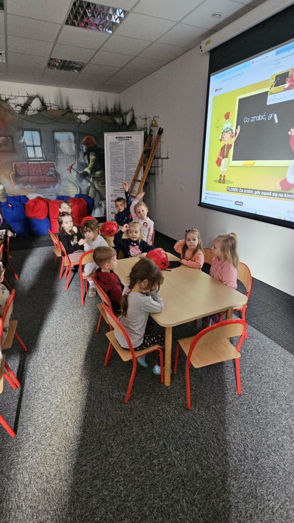 Dzieci swoją przygodę rozpoczęły od zajęć w specjalnej sali edukacyjnej. Tam obejrzały filmy pokazujące, jak należy zachować się w sytuacji zagrożenia pożarem – zarówno w domu, jak i w szkole. Strażacy w przystępny sposób wyjaśnili najmłodszym, jak prawidłowo zgłosić wypadek oraz jak wezwać pomoc. Przedszkolaki dowiedziały się również, jak reagować, gdy ogień pojawi się w lesie lub na łące.