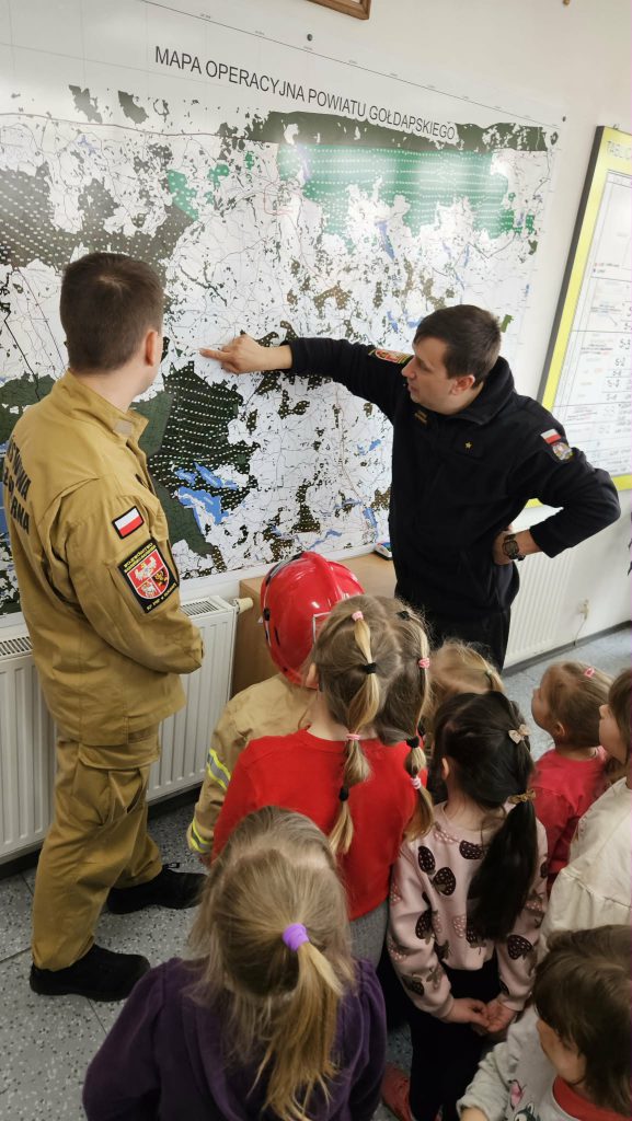 Dużym przeżyciem był także przygotowany specjalnie dla najmłodszych pokazowy alarm. Przedszkolaki zobaczyły, jak szybko strażacy przygotowują się do wyjazdu na akcję. Mogły również zobaczyć pomieszczenie, w którym odbierane są zgłoszenia, specjalny telefon alarmowy oraz mapy powiatu pomagające w dokładnym określeniu miejsca zdarzenia.